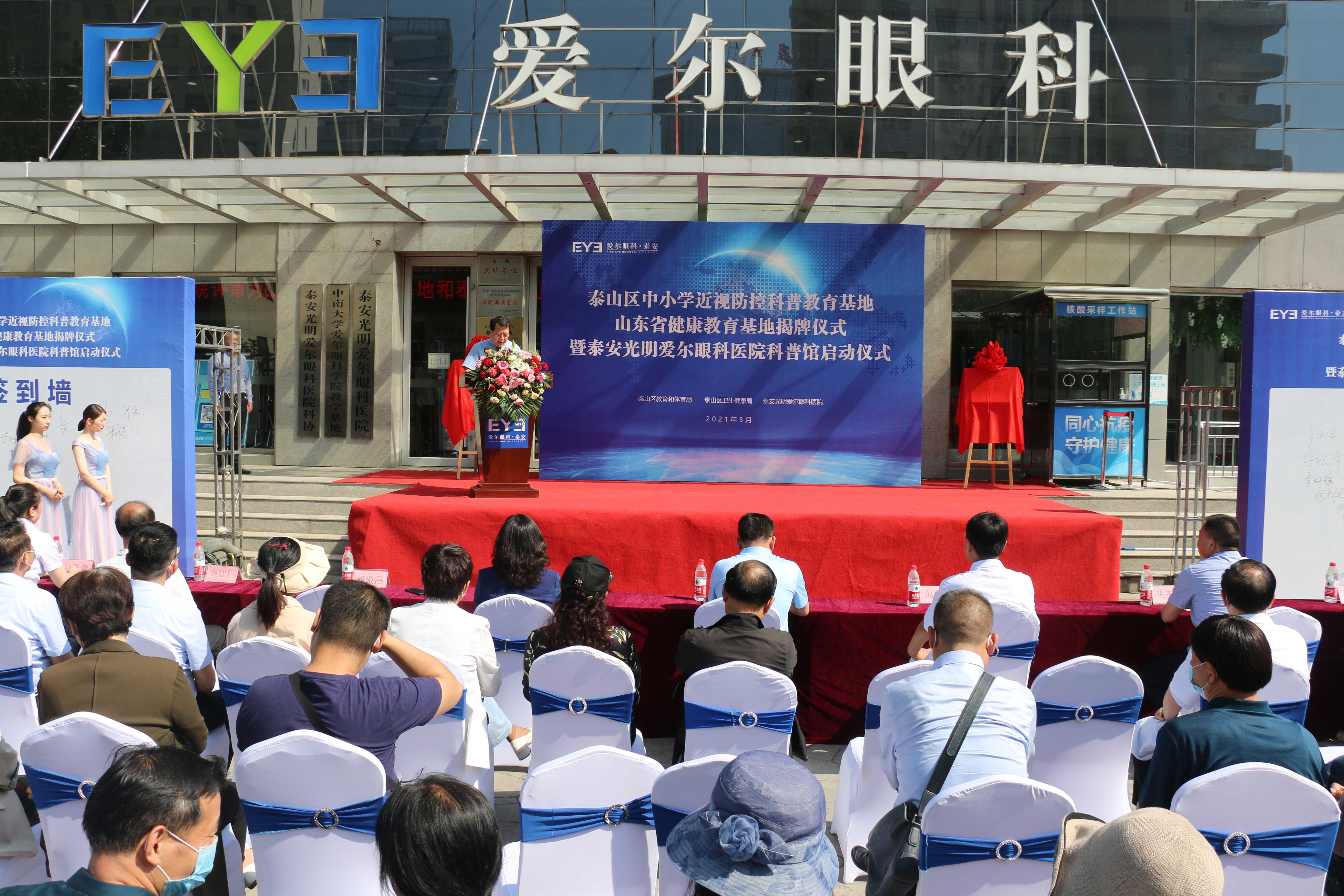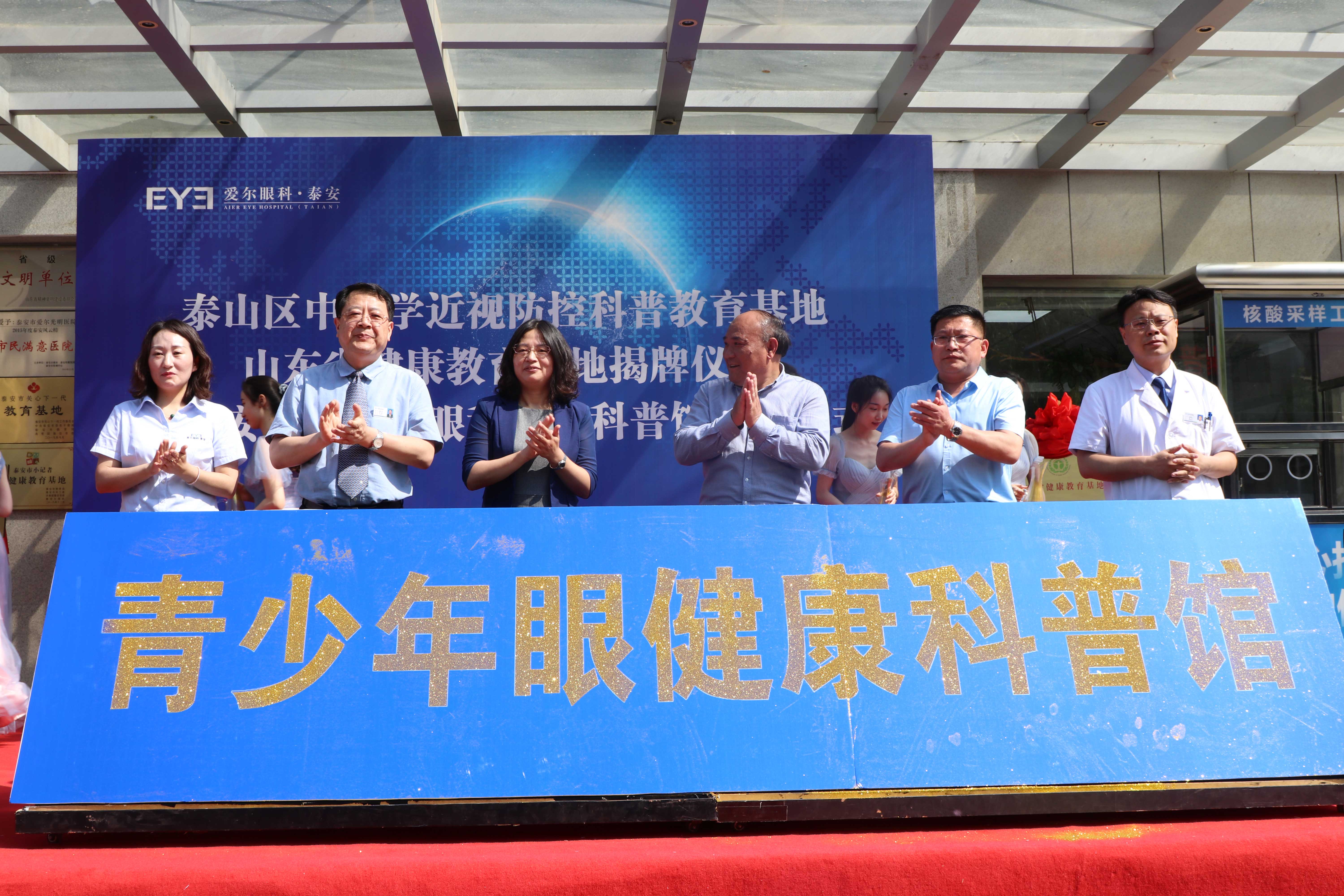 ? ? ? ?九點(diǎn)二十分,“山東省健康教育基地”和“泰山區(qū)中小學(xué)近視防控科普教育基地”正式揭牌。隨后,泰山區(qū)衛(wèi)生健康局黨組成員、副局長寧方莉、泰山區(qū)教育和體育局副局長高京杰、泰山區(qū)疾病預(yù)防控制中心副主任梁洪濤、泰安光明愛爾眼科醫(yī)院CEO楊敬昌、院長范傳峰、社會(huì)公益部主任王海燕登臺,宣布泰安市眼健康科普館正式啟動(dòng),并向市民免費(fèi)開放。
